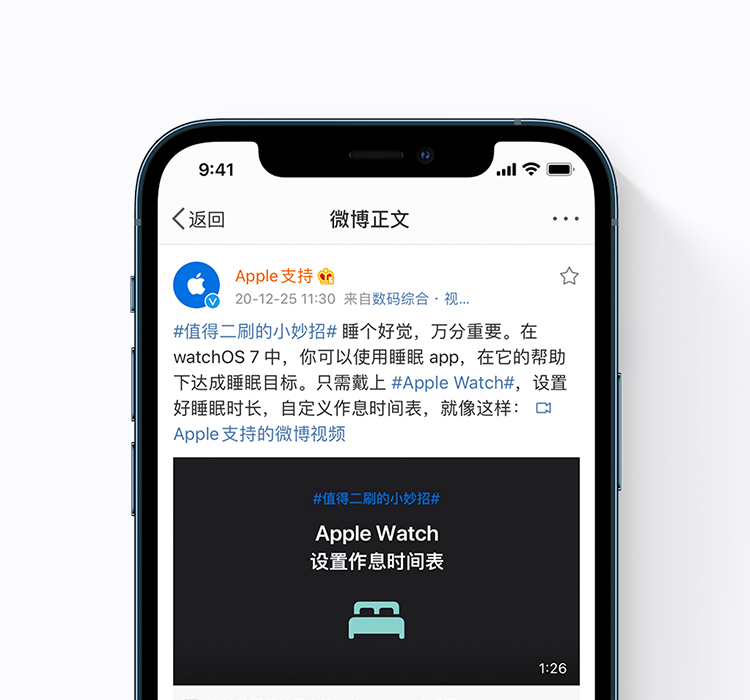 睡个好觉,万分重要。在 watchOS 7 中,你可以使用睡眠 App,在它的帮助下达成睡眠目标。只需戴上 Apple Watch,设置好睡眠时长,自定义作息时间表。想了解更多,请点击 Apple 支持的微博视频。