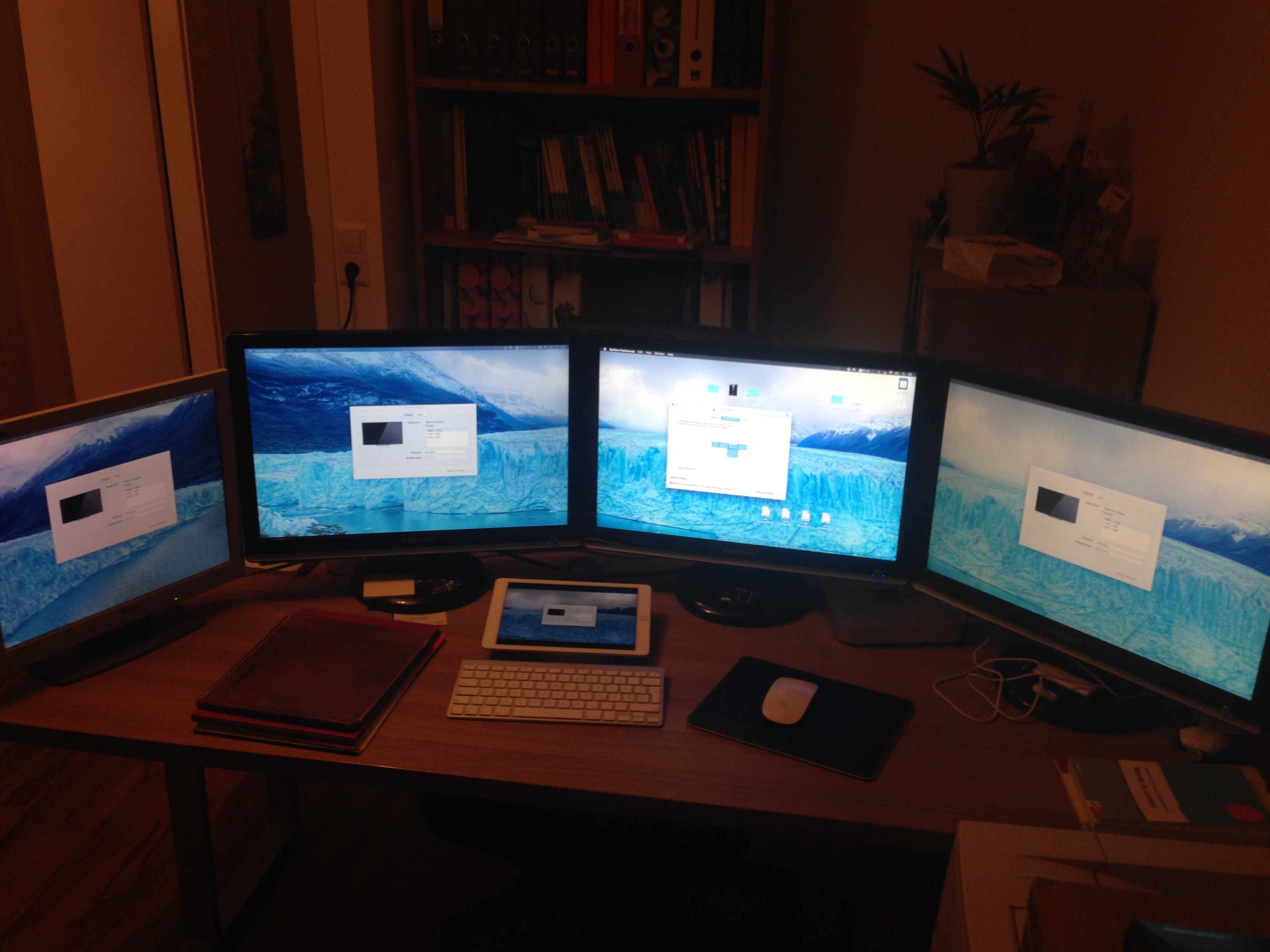 下图是接了5个县设设备(一个HDMI,一个MiniDP,两个用USB3双显转接器,一个用Air Play--iPad)