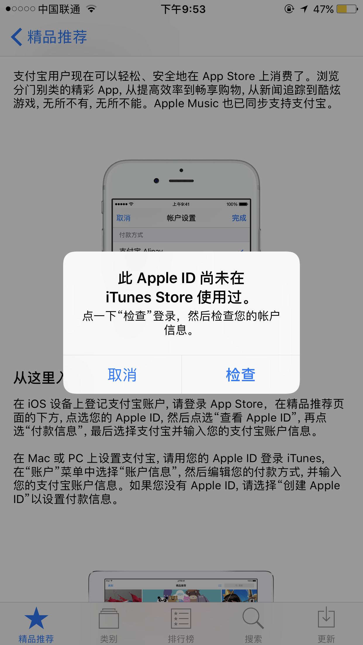 这可能是因为当首次使用 Apple ID 登录 iTunes Store 时,您需要完善 Apple ID 的账户信息,例如付款方式。请您点击“检查”来进行下一步的操作。在您购买任何物品之前,我们不会收取任何费用。同时,您可以在登录商店后选择更改或移除这种付款方式。系统不会再要求您提供付款方式,直到您进行首次购物。