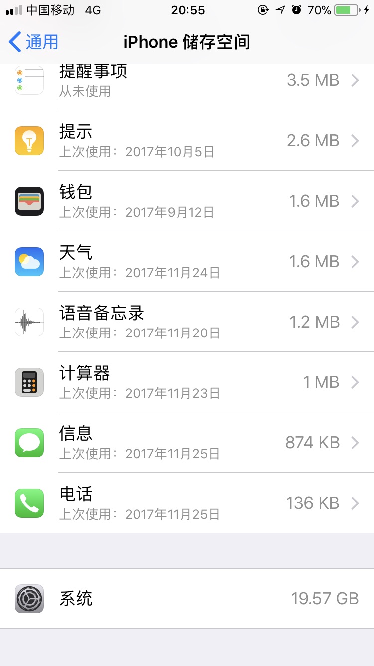 在 iOS 11 中,“系统”占用分列出来,其中很大一部分都是所谓的临时文件,也就是缓存。系统会自动调节,如果空间充足,就多一点,否则就自动删掉。
