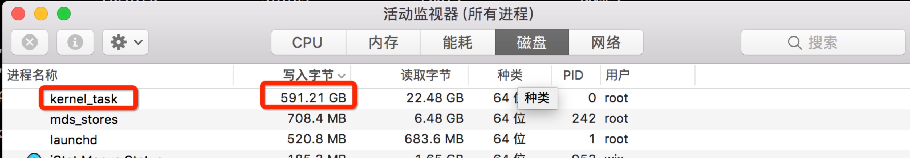 kernal写数据,有可能是比如内存不够,它往硬盘写可以临时从内存卸载的数据到硬盘,或者是某个程序通过kernal在大量写数据处理大数据,比如打开了大量照片或视 频等文件。还有一种可能是某个程序出错了,还有可能是系统服务出问题,比如Spotlight。