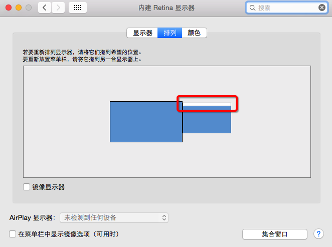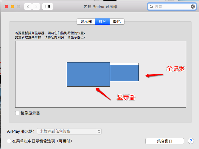 6、如果你不喜欢这种并列显示的方式,也可以切换会传统的直接投影模式,勾选图中的“镜像显示器”就可以让你Mac和外接显示器的显示内容保持同步了。