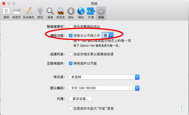 2.然后点击“高级”,在辅助功能中勾选如图,可以将字体调整为需要的大小,这样打开的每一个网页都是您设置的字体大小。