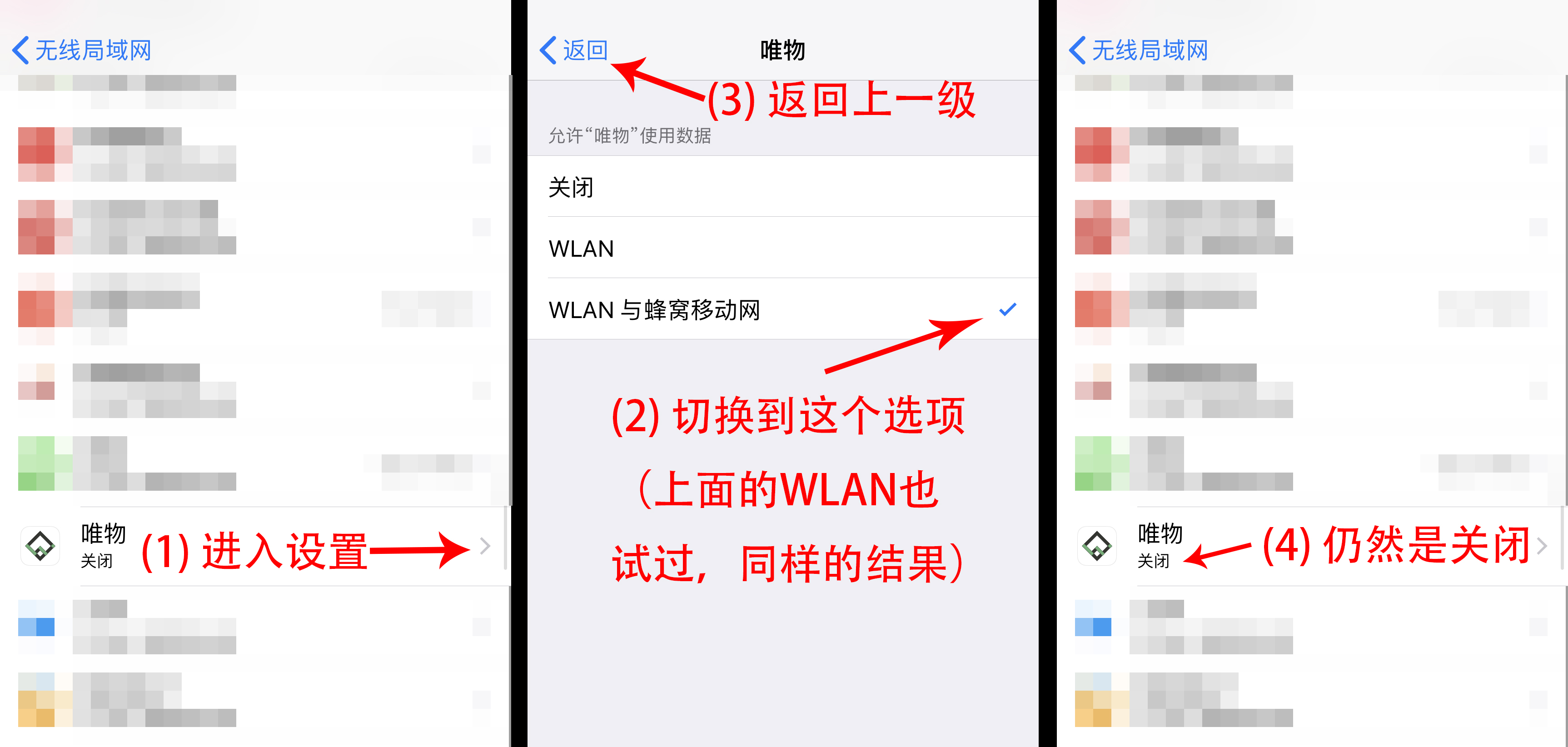 我知道在设置里可以设置 app 的网络开关,我试过反复切换到 “wlan”,切换到 “wlan 与蜂窝移动网”,无论我切换成哪个选项,在返回上一级菜单后,开关仍然是关闭状态。就是等于这几个选项跟本不起作用:
