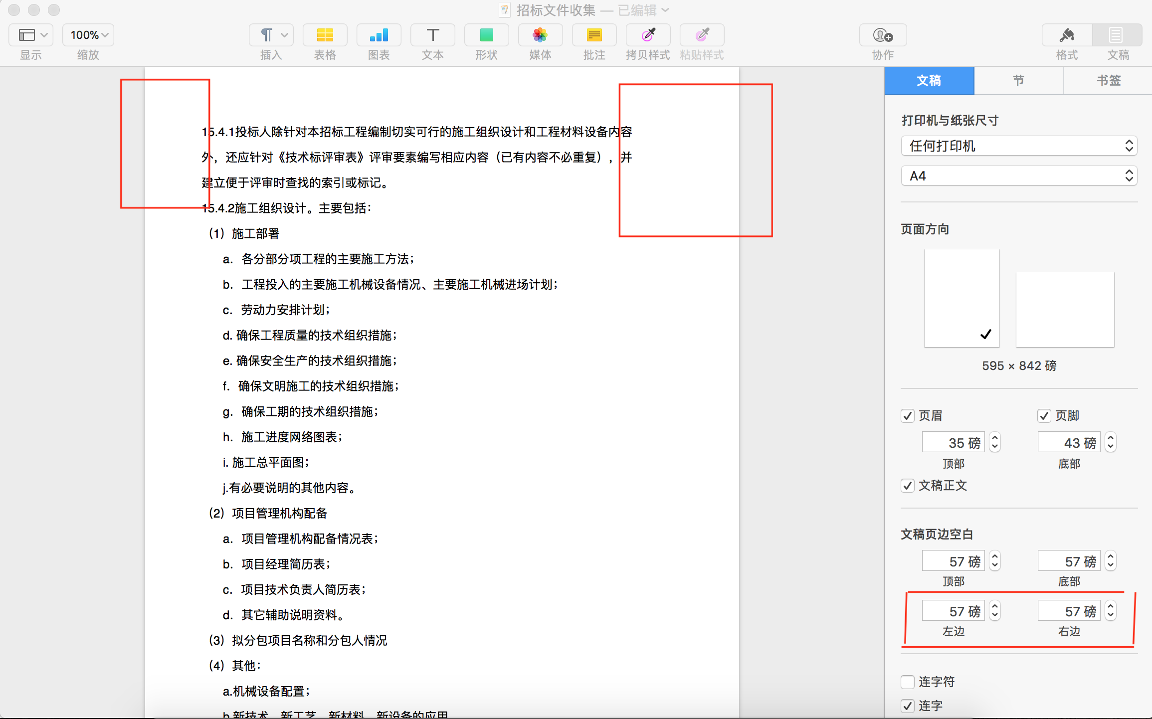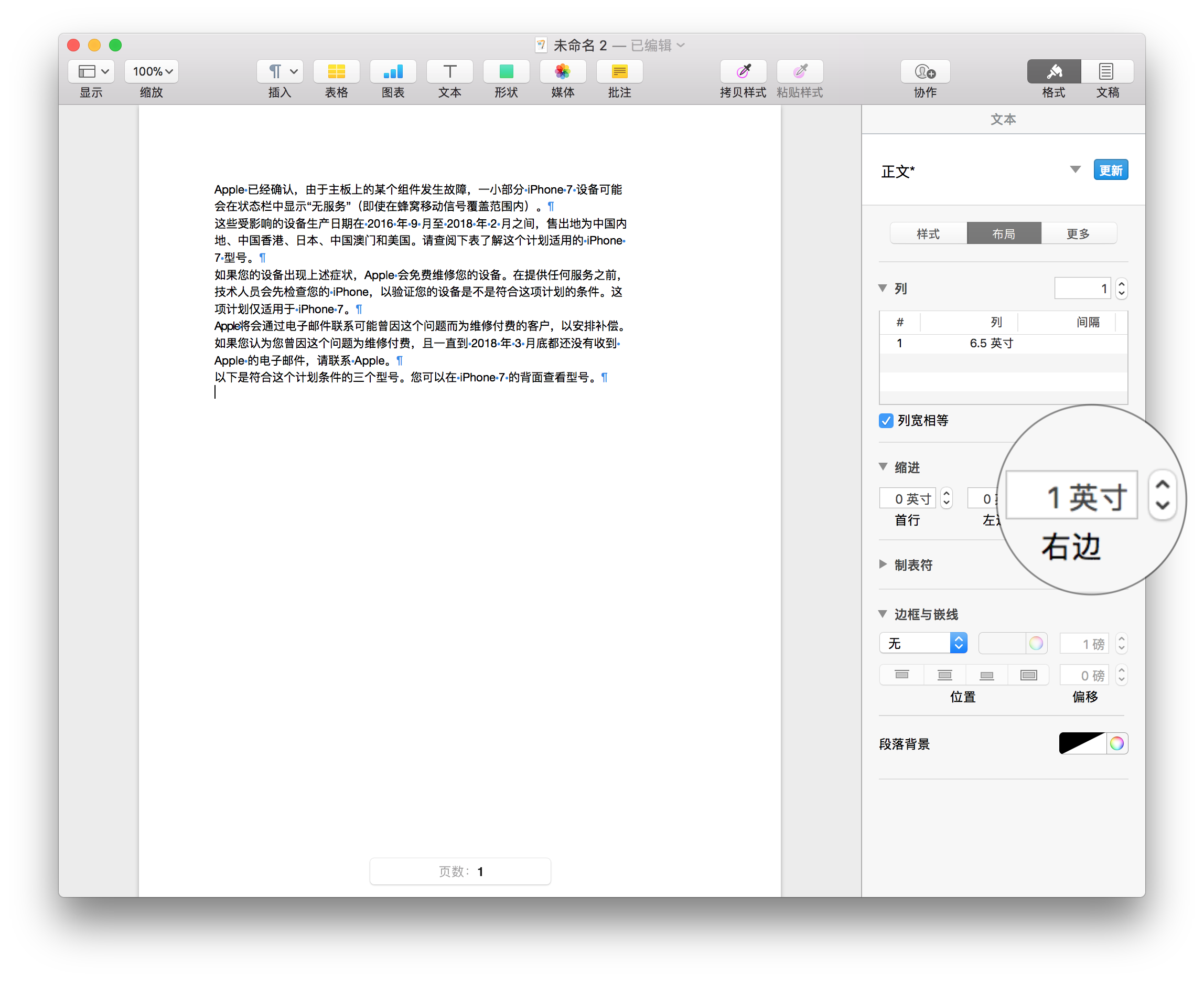 留意区分 “格式—布局—缩进” 和 “文稿—页边空白”。两个设置是互不影响的。