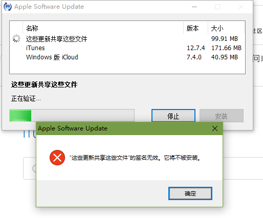 不仅是“这些更新共享这些文件”的签名无效,后续的iTunes和windows版iCloud也提示签名无效,它将不被安装。