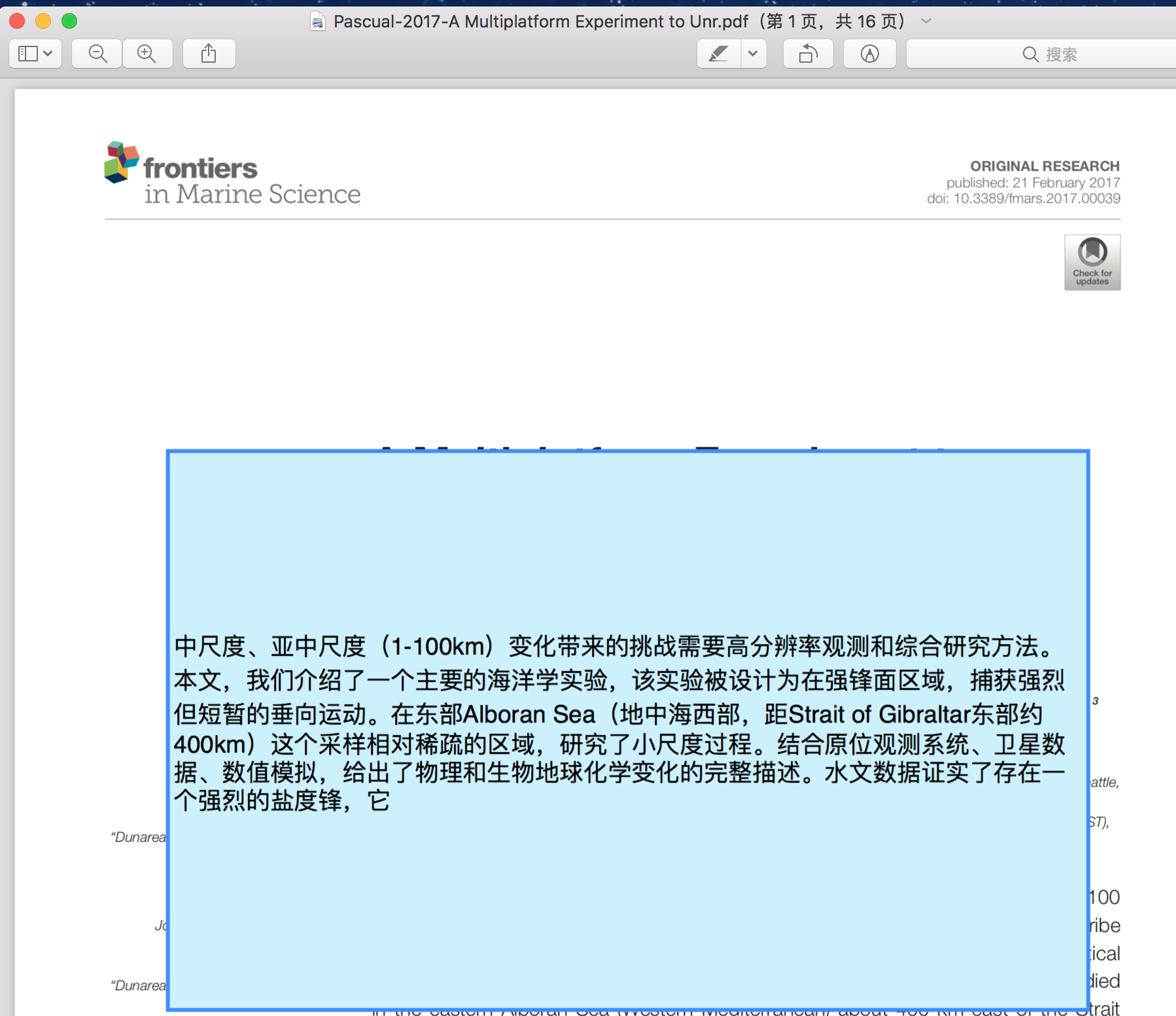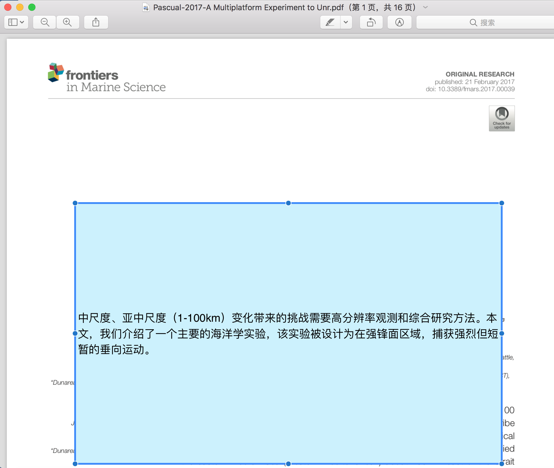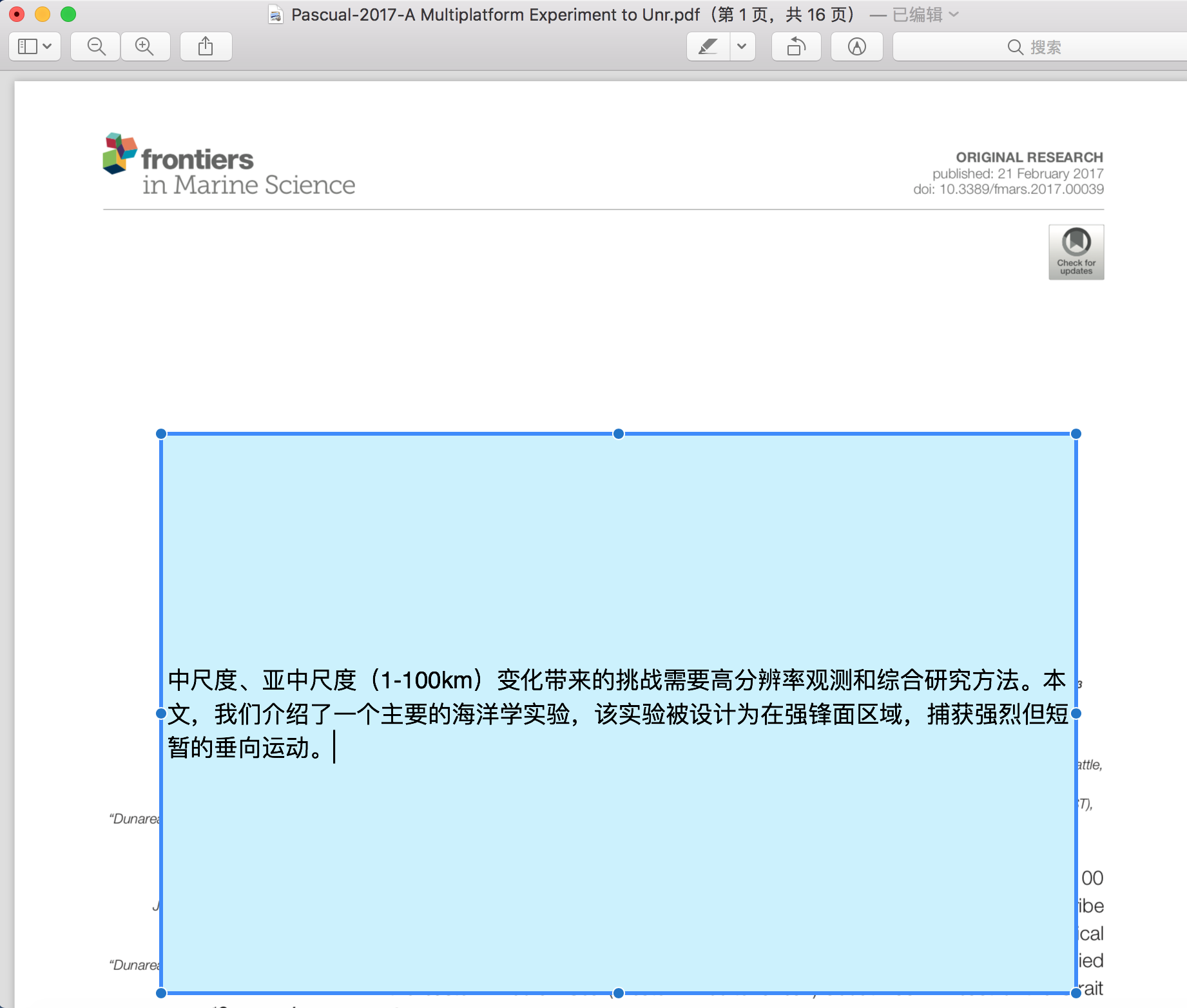 使用预览向PDF文件中插入注释后(工具——注解——矩形,在矩形中添加了文字),再次打开显示正常,如图