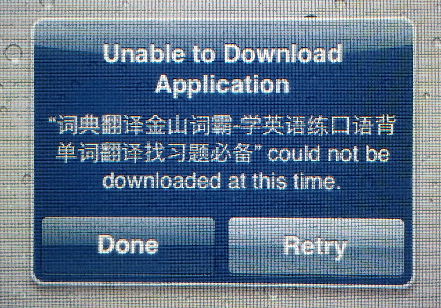 有一个很久没用的美版 iPad 1,这两天拿出来玩了一下,发现不能下载任何已购应用,这些应用确实有支持 iOS 5.1.1的版本,试了很多原来在 iOS 5.1.1下可以用的Apps,发现都不能再下载。而且删除原本已安装在iPad上的可正常运行的 chrome 后,也无法再下载了。总是出现 "Waiting...",等上1分多钟后,给出提示说“不能下载”。试了很多原来已购的应用,没有一个可以下载的。