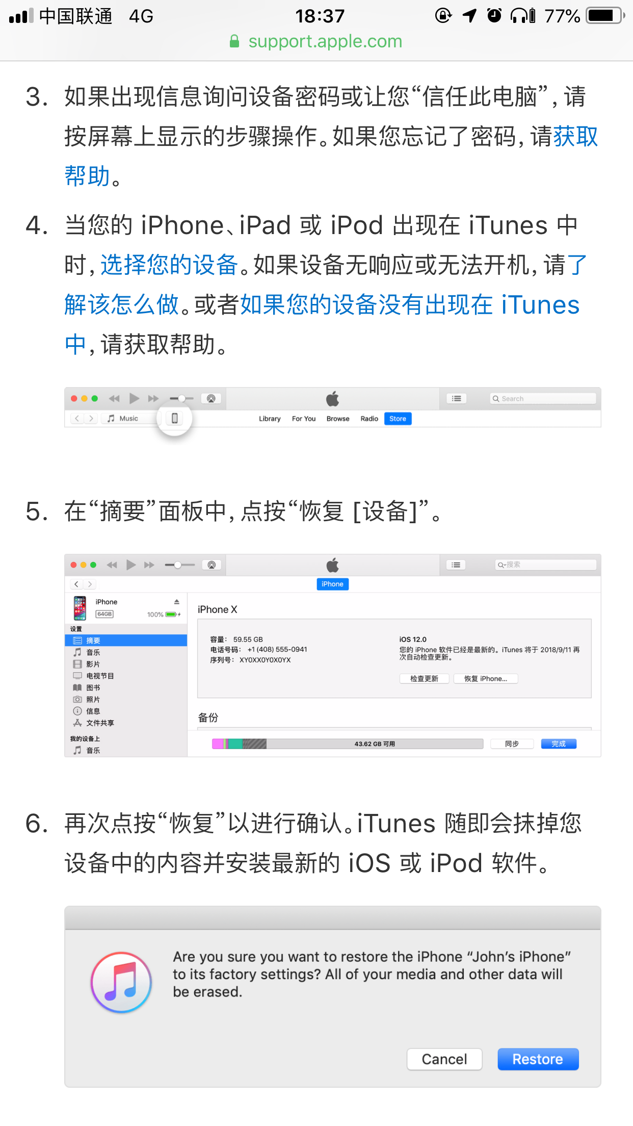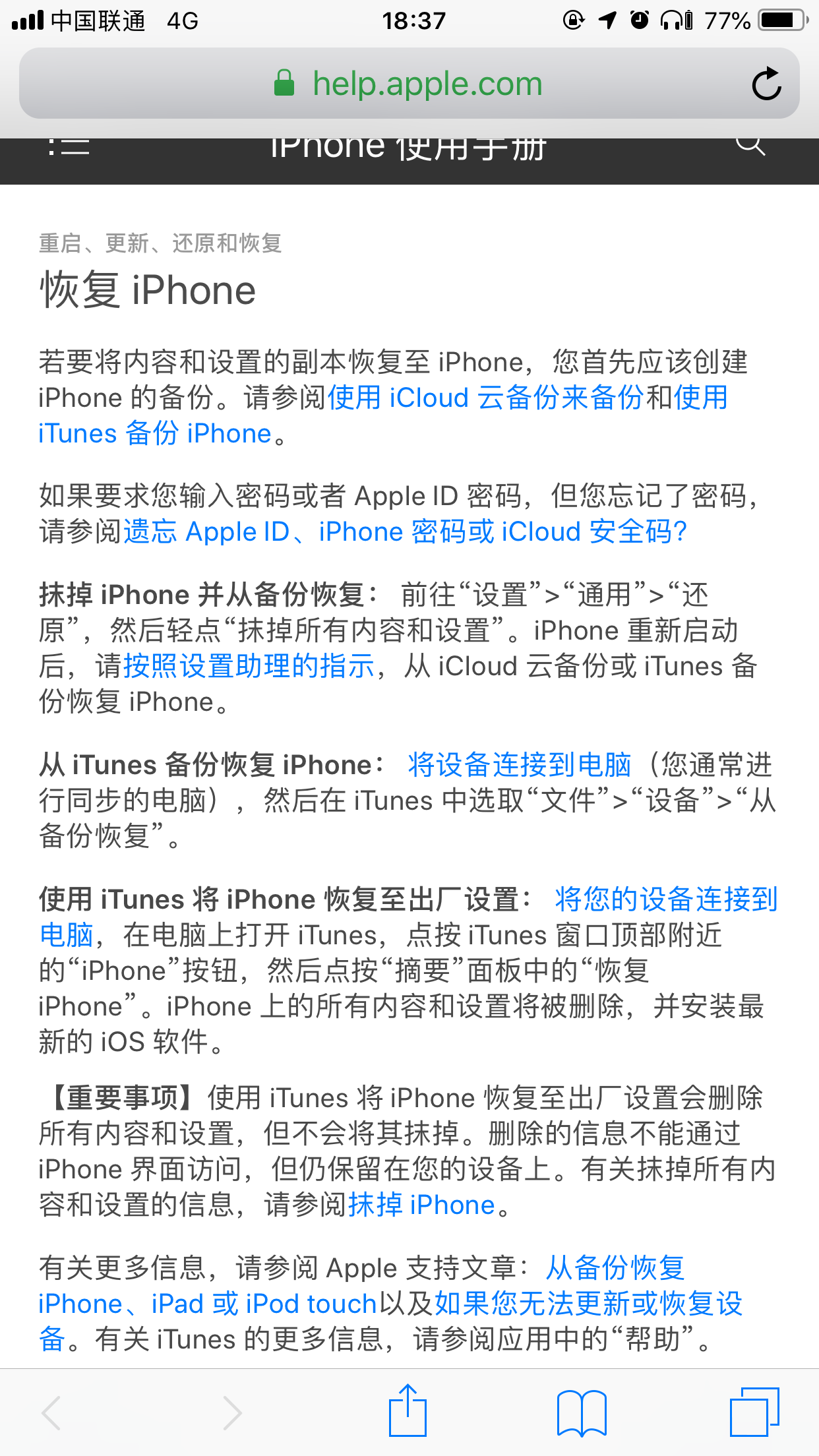 截图第一页第6点说,使用iTunes恢复iPhone时会将其抹掉,但是截图第二页重要事项的描述是只会删除内容,但不会抹掉iPhone,二者的描述bing bu yi zhg