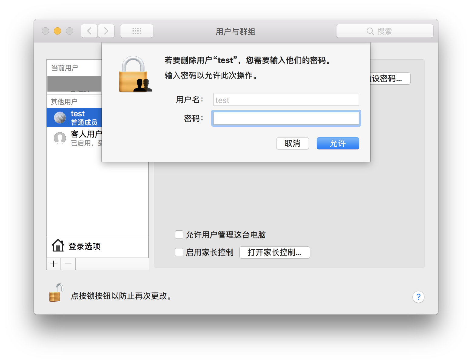 rm: /Users/test/Library/Preferences: Operation not permitted