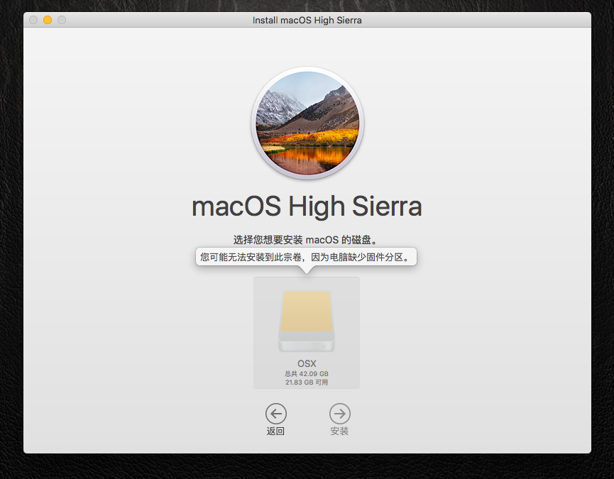 问题:mac 10.12.6 升级 macOS mojave 版本,进入按装选则按装系统硬盘时,或者用u盘驱动盘安装系统都出现“您无法安装到此卷宗,因为电脑缺少固件分区”,最后无法升级。ps:外置固态硬盘 。例如下图