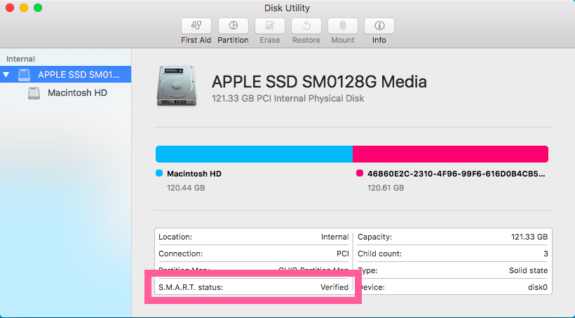 先到 磁盘工具 应用中,选中该硬盘,看它的S.M.A.R.T.信息是否支持, 如下图: