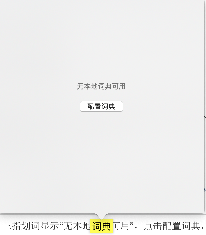 系统自带词典无法使用,三指划词显示“无本地词典可用”,点击配置词典,词典APP被打开但是无界面,偏好设置、打开词典文件夹均为灰无法点击。