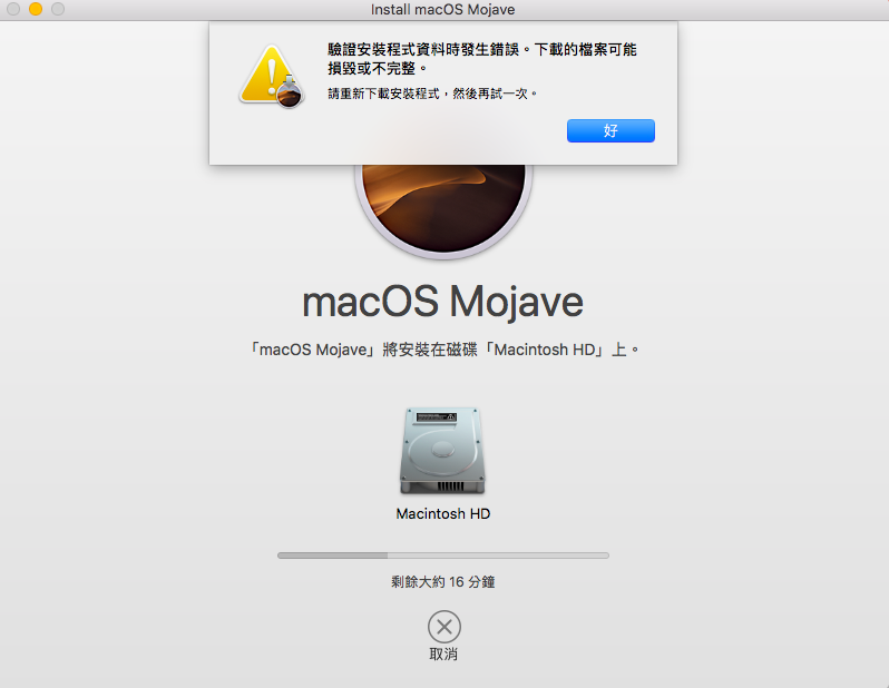 升級macOS Mojave一直出現「驗證安裝程式資料時發生錯誤。下載的檔案可能損毀或不完整。」