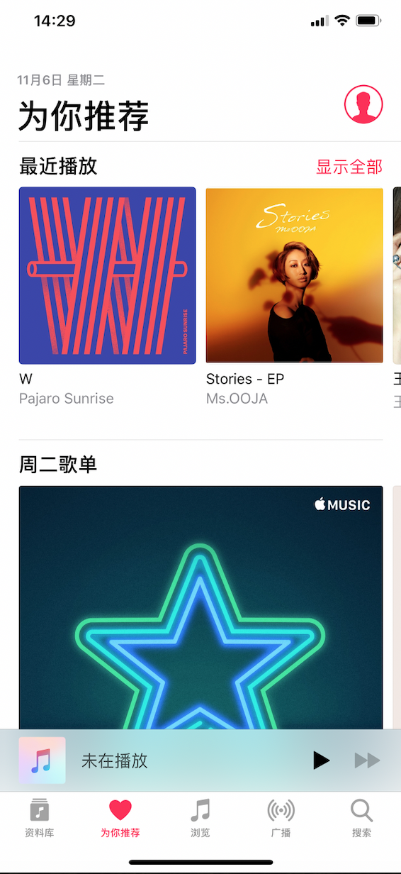 “Apple Music”中“为你推荐”部分取决于以下因素: