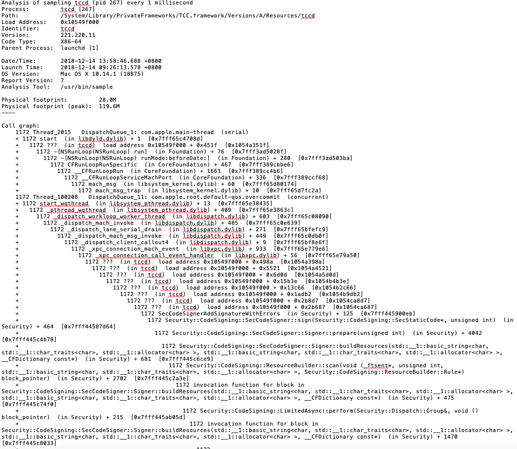 第三张图是进程采样,原文件是个txt,这个是开头的截图,剩下的几千行是重复的图中的堆栈信息,一个进程疯狂的执行同一个操作,这明显不正常。