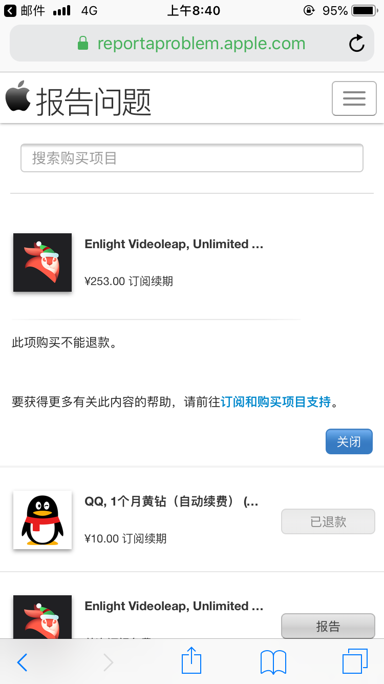- 浏览该链接 https://reportaproblem.apple.com/ ,然后点击要退款的APP报告问题;