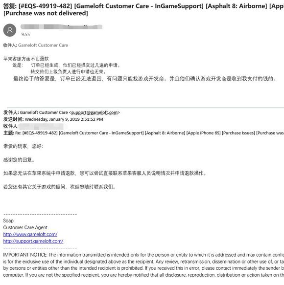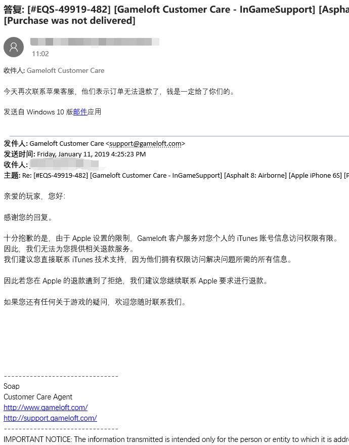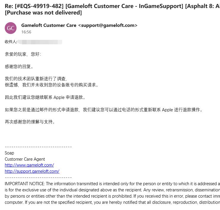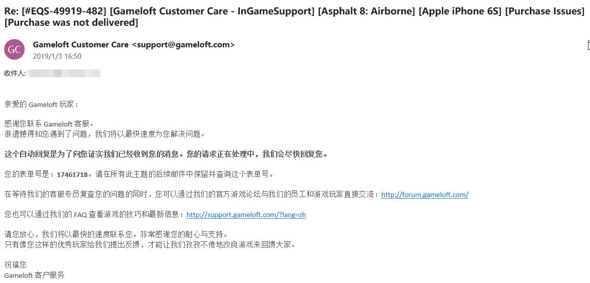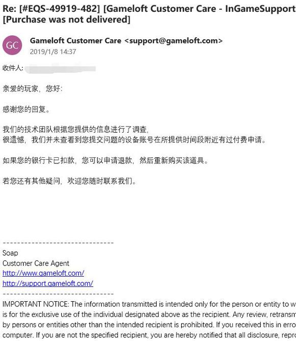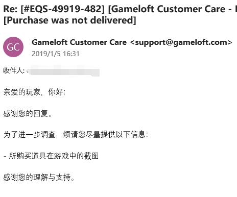 再过了一天:Gameloft客服回复了一个:游戏截图????????这是什么意思???