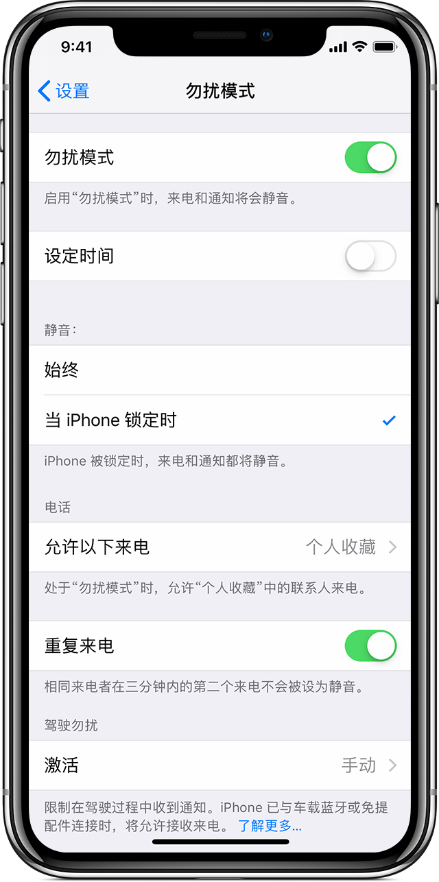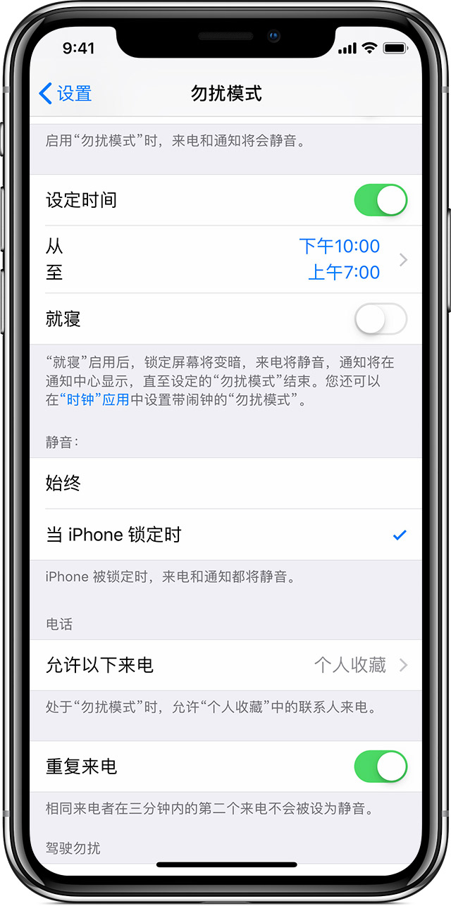 借助“勿扰模式”,您可以将设备锁定期间收到的来电、提醒和通知静音。您还可以设定“勿扰模式”的开启时间以及允许特定联系人来电时响铃。