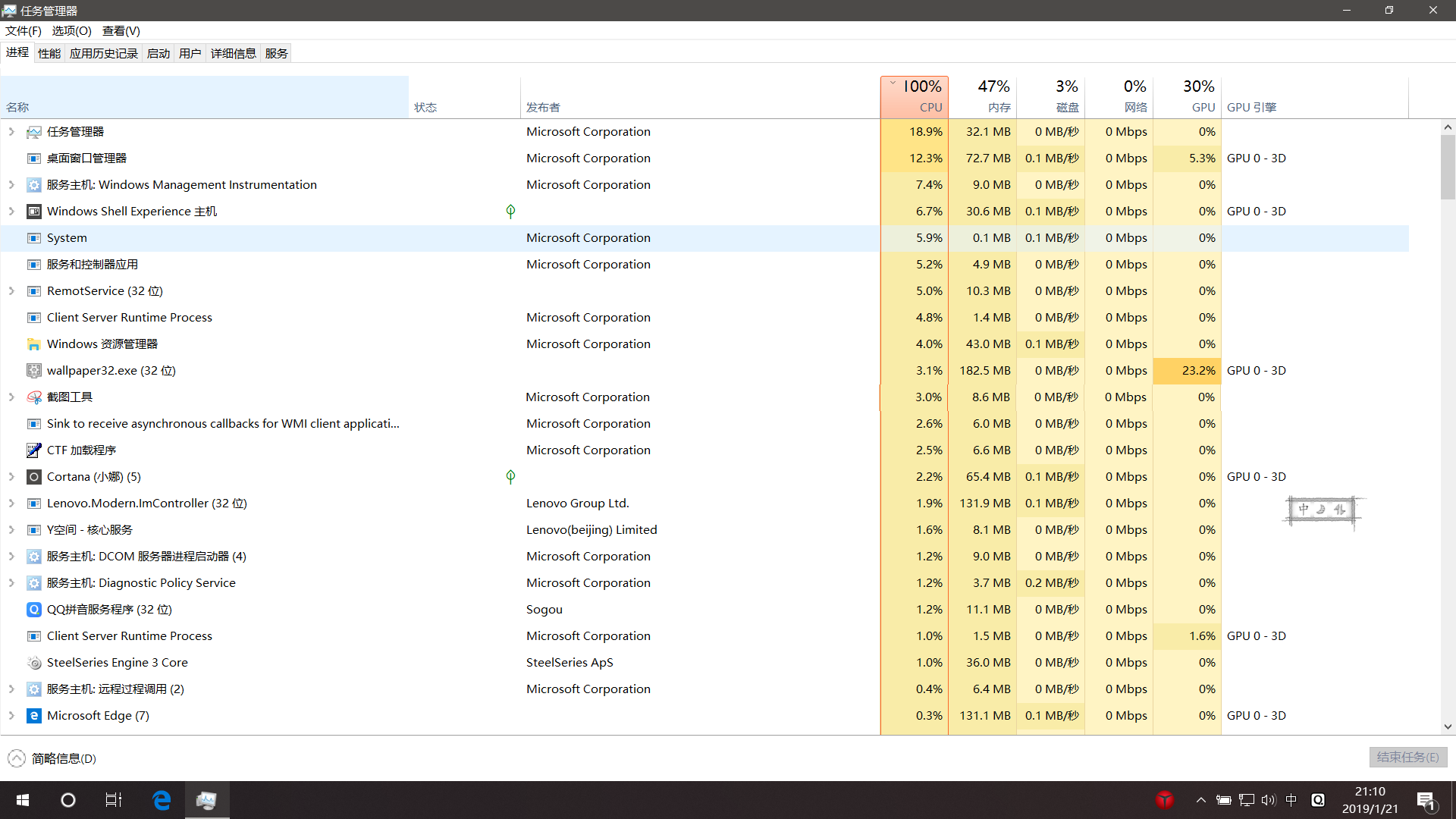 再重启进入正常系统,此时打开任务管理器,进程消失,但是显示CPU占用率100%(图3)。但是没有什么占用特别大的进程,恢复之前回收站的文件,重启电脑,进程又出现 ,CPU 占用率正常。