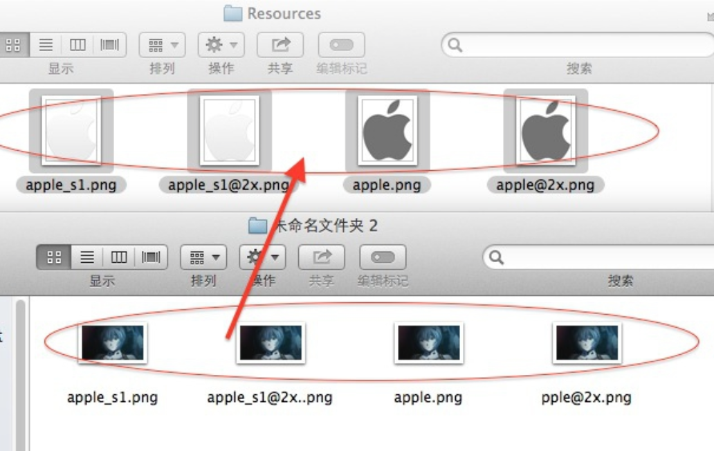 4、在这个新打开的文件夹中,找到四个苹果Logo的图片文件,文件名字就是上面提到的那四个,之后用你的新制作的PNG壁纸文件【替换】原有的四个苹果Logo图片文件 。