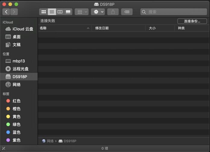 在访达左侧的“位置”能够显示 NAS 的名称。但是点击之后提示连接失败。点击右上角的“连接身份”没有反应。