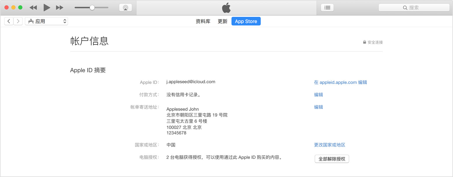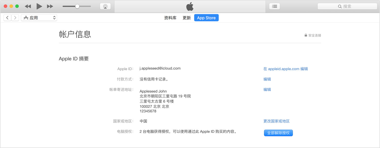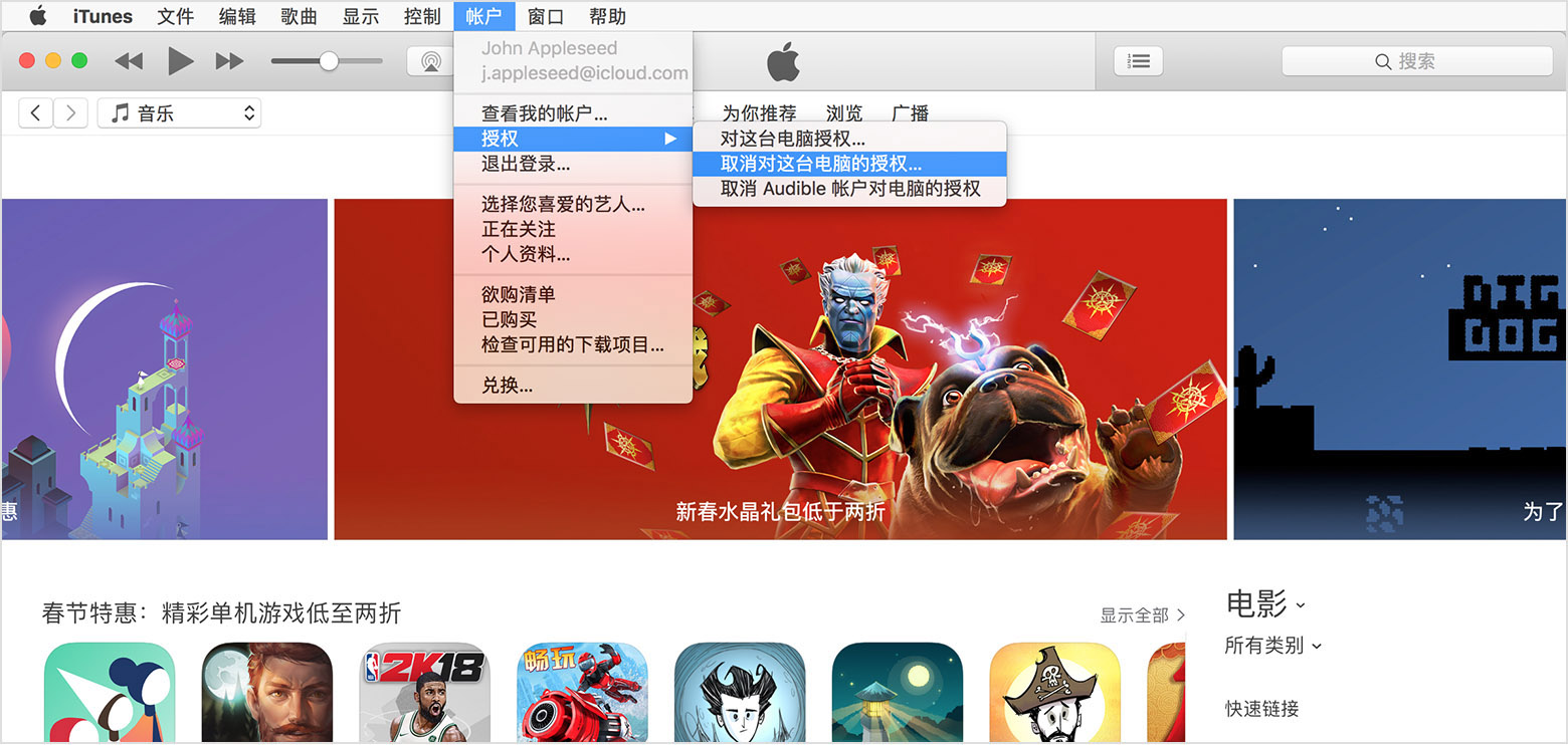 在您取消对电脑的授权时,将会移除其访问您从 iTunes Store、iBooks Store 或 App Store 所购部分内容(如音乐、影片、电视节目、应用和图书)的权限。您的内容不会丢失,也不会从电脑中删除任何内容。在您取消对电脑的授权时,仅会阻止其访问受保护内容。以后,您可以再次对电脑授权。