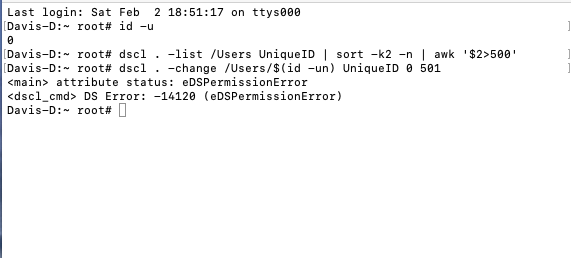 dscl . -change /Users/$(id -un) UniqueID 0 509