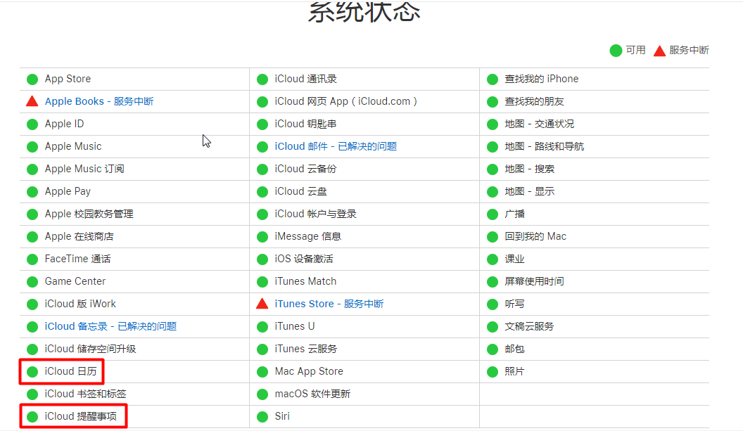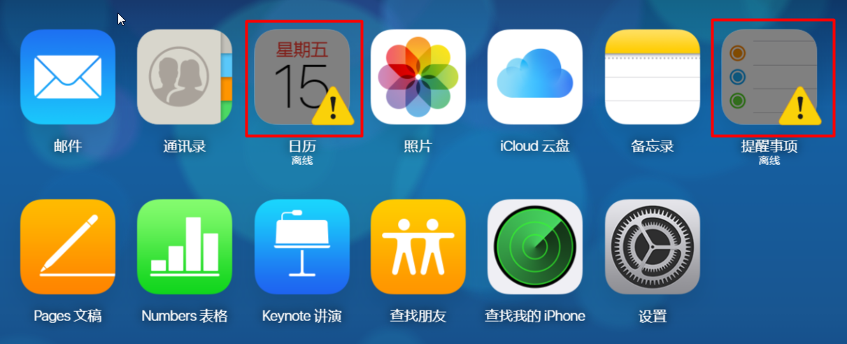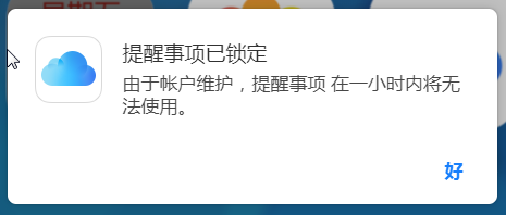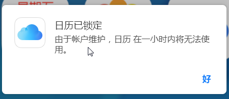 登录网页iCloud(https://www.icloud.com/)点击日历和提醒事项均提示“已锁定,由于帐户维护,在一小时内将无法使用”,如下图: