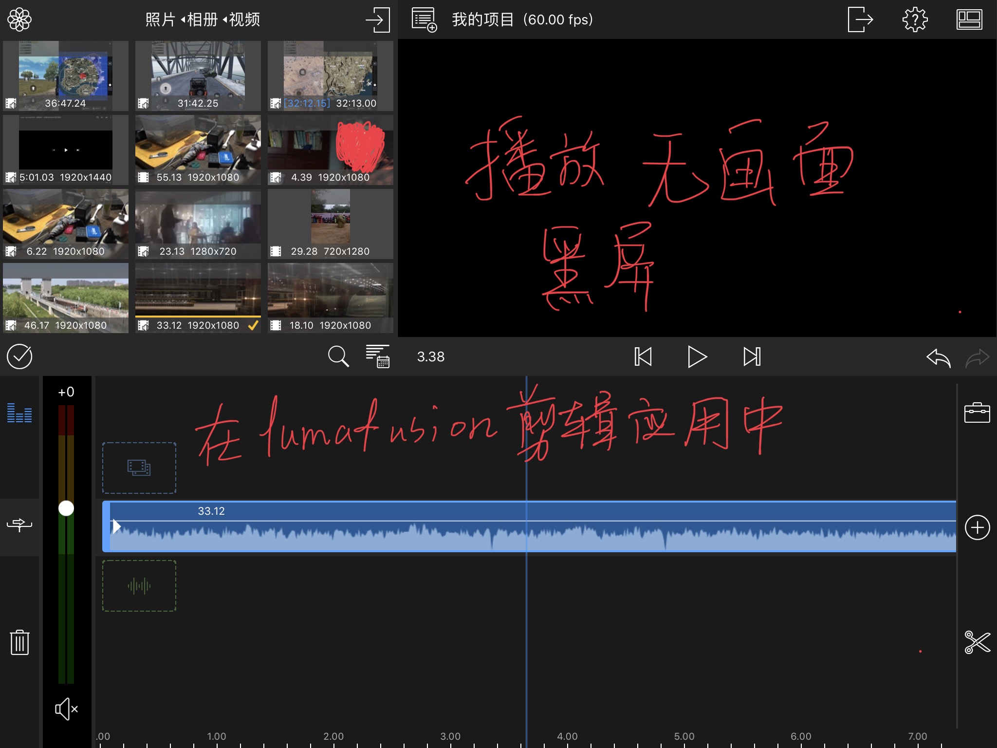 在lumafusion剪辑中把视频拖入时间线中,仍无法播放画面框黑屏