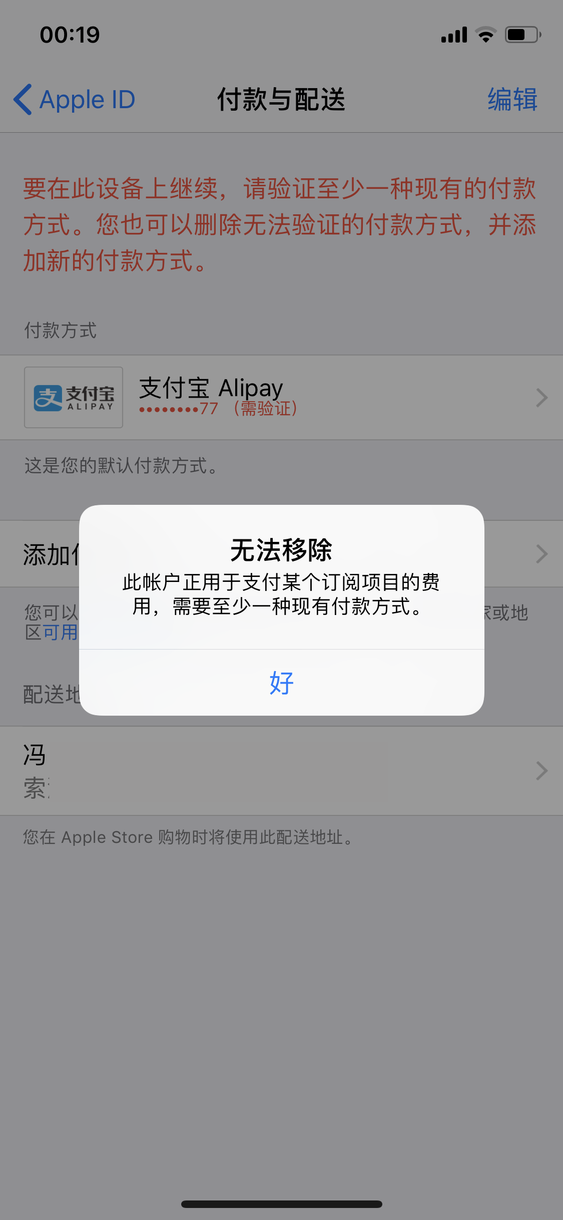 我的付款方式只有一个支付宝,现在显示需要验证。当我开始验证时,收不到验证码。已经确认过号码可以正常接收短信。目前我无法在App store上下载应用,无法移除当前付款方式,无法添加新付款方式,订阅的项目已经取消,只是时间还未到。求助各位
