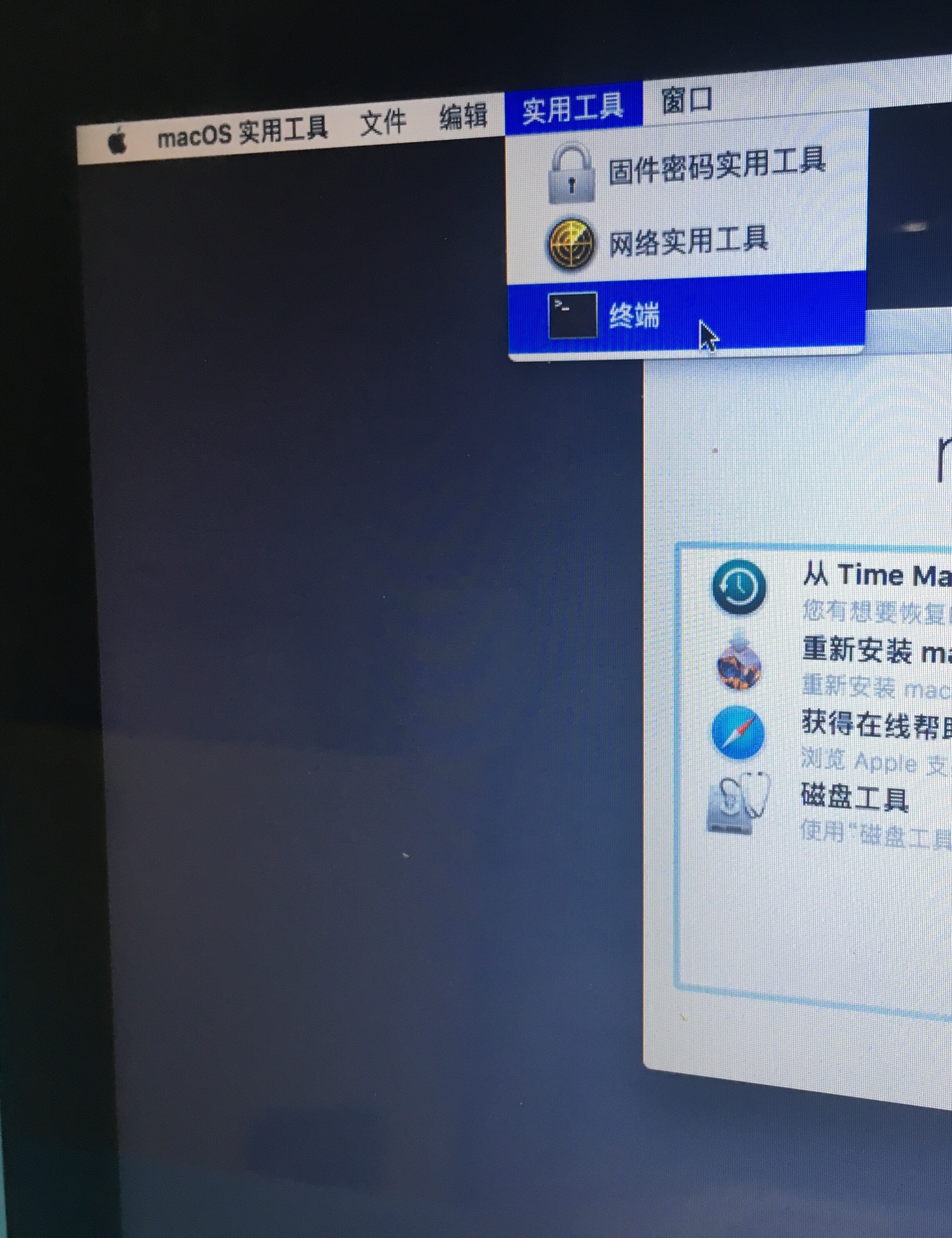 Mac使用窗口菜单栏没有实用工具,只有“从时间机器备份”、“重新安装”、“获得在线帮助”、“磁盘工具”这些