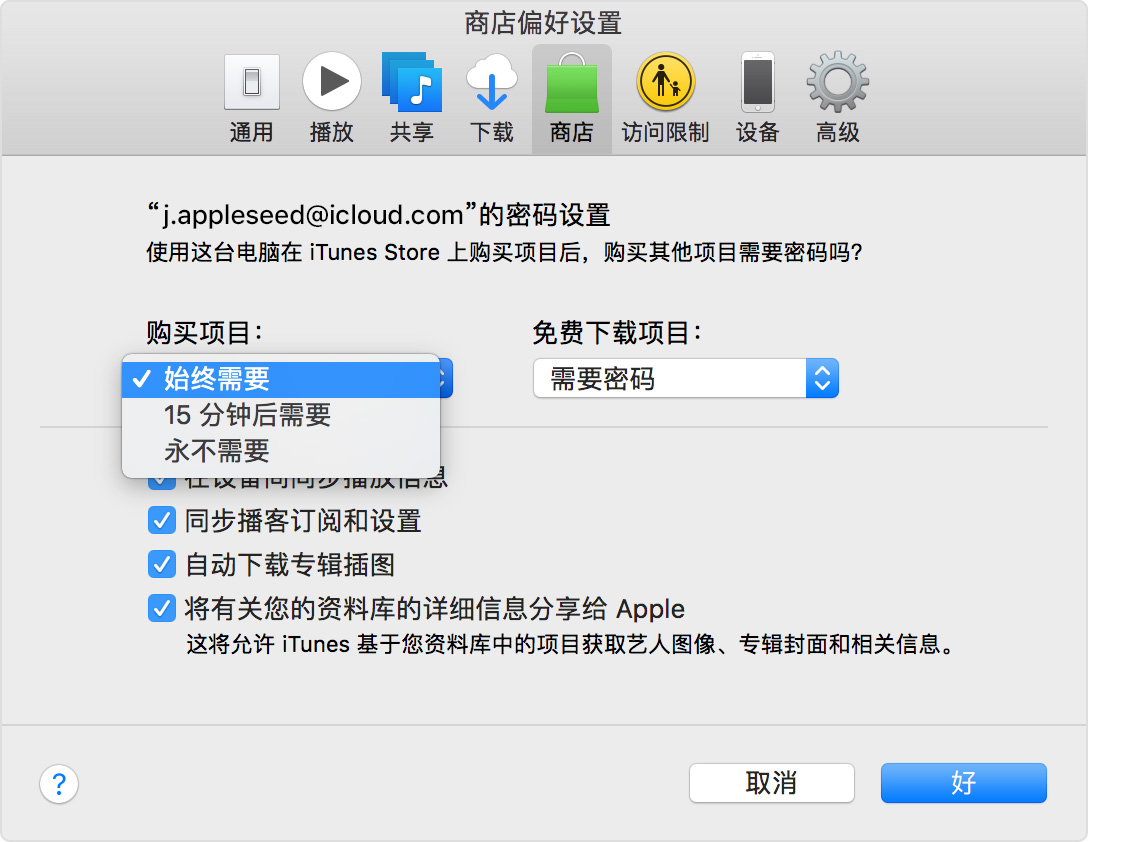 管理 iTunes Store 和 App Store 密码偏好设置 - Apple 支持