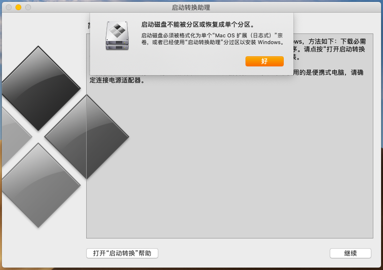 根据提示,需要您通过磁盘工具将windows的bootcamp分区格式化成,Mac OS扩展(日志式),才可以通过启动转换助理将它合并分区。
