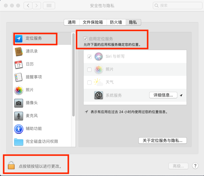 关于定位服务可以在系偏好设置 安全与隐私 隐私里设置 需要先点开下边的小锁