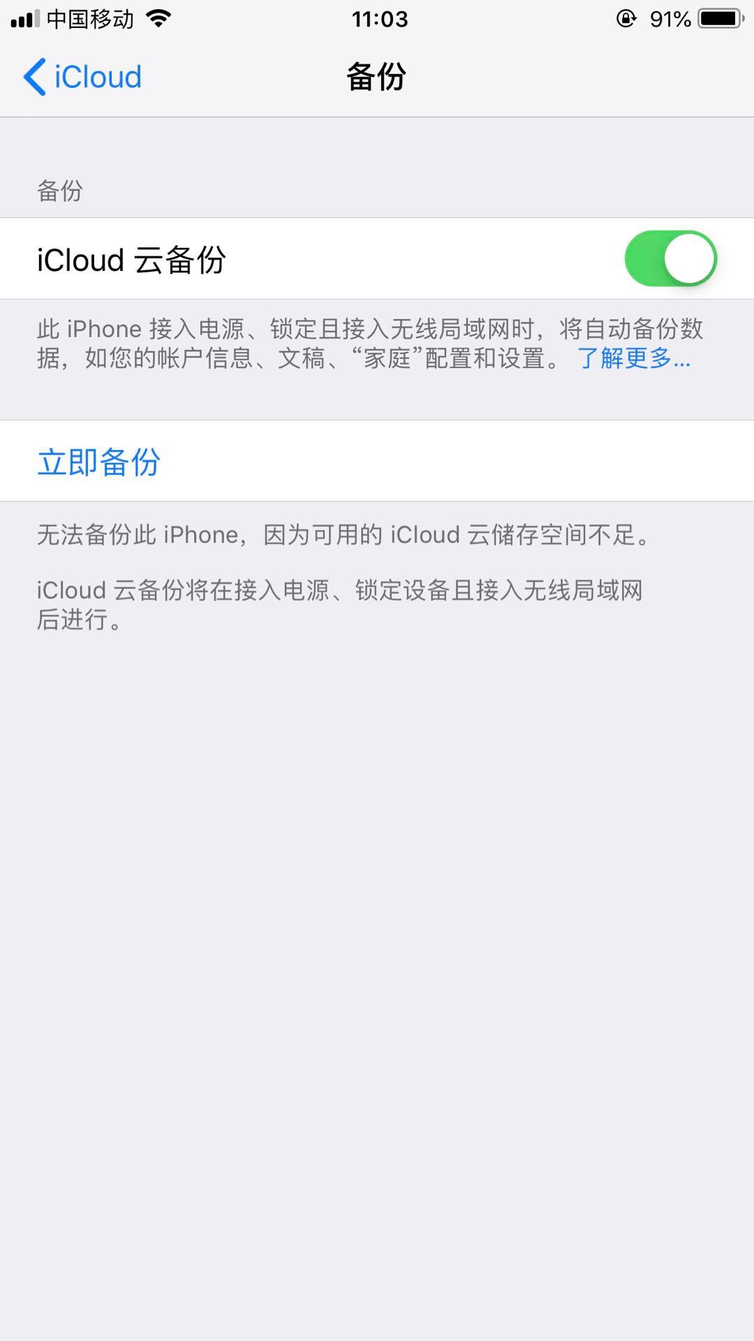 前一个多月左右把 icloud之前的备份删除了,然后清理了一下手机里面的相差,留了只有几十张的图片,现在我想把这些备份起来,总是提示无法备份!提示icloud云储空间不足,可是我明明就有很多空间,而且备份的照片就只有几十张!为什么总是备份不了?