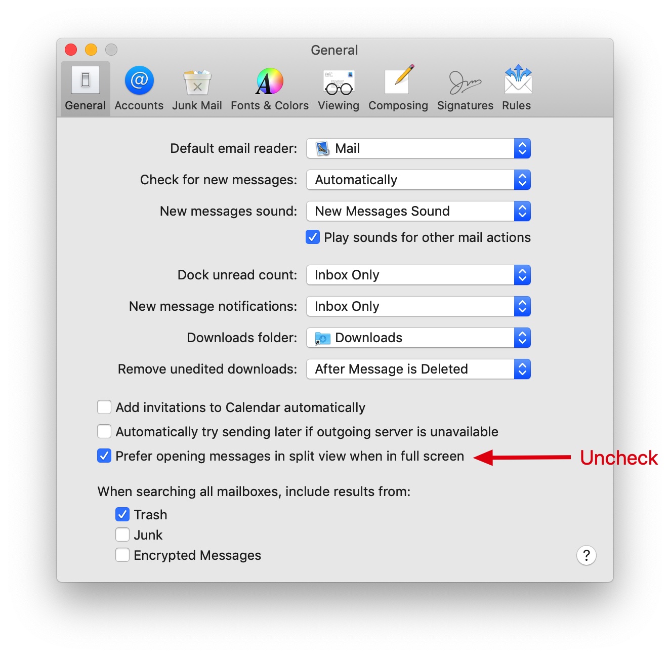 Mail >Preference > uncheck the option "Prefer opening messages in split view when in full screen", and u will be fine.