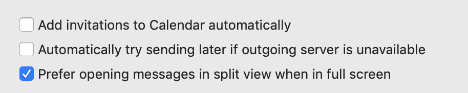 可以在邮件应用的「偏好设置」里检查下是否开启了「在全屏模式下分屏显示」的选项,我也刚刚发现,正在尝试看看效果。
