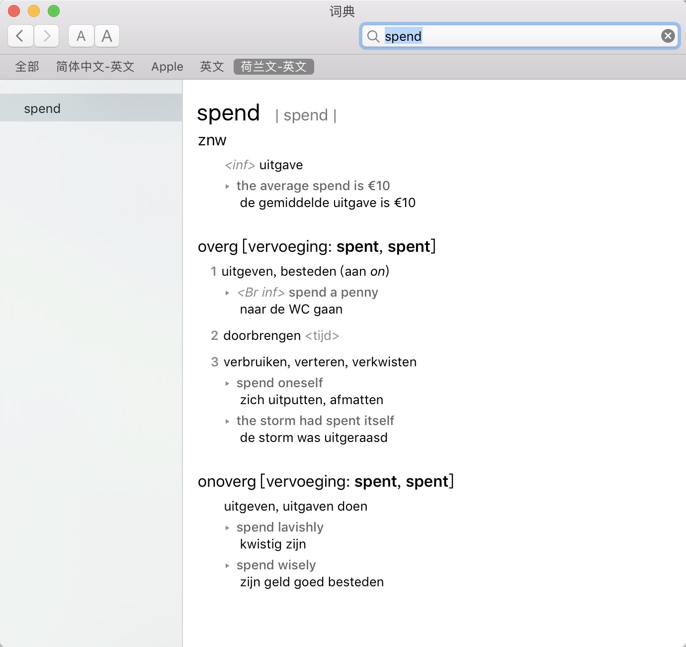 如图所示,并且我在词典的设置里修改了搜索结果,依然不行,只能改变自己打开词典时,上面的类型,通过这种方式定义单词,首选依然时荷兰文-英文,真的时很奇怪