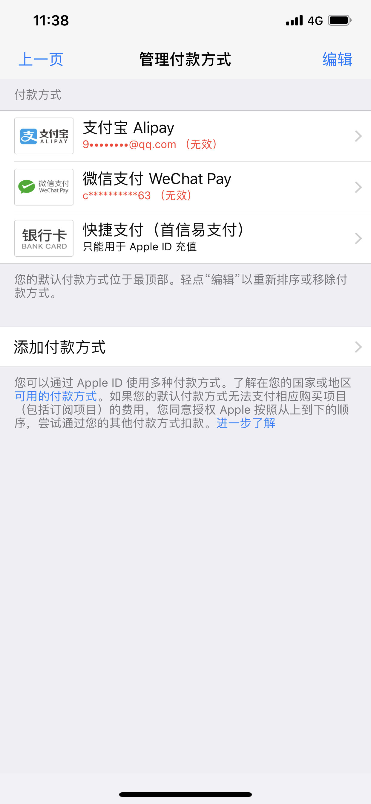 如果您要更改付款方式,请使用您所在的国家或地区有效的付款方式,并确保有可用的资金。要避免以后出现未付款的订单,您可以向您的 Apple ID 添加多种付款方式。