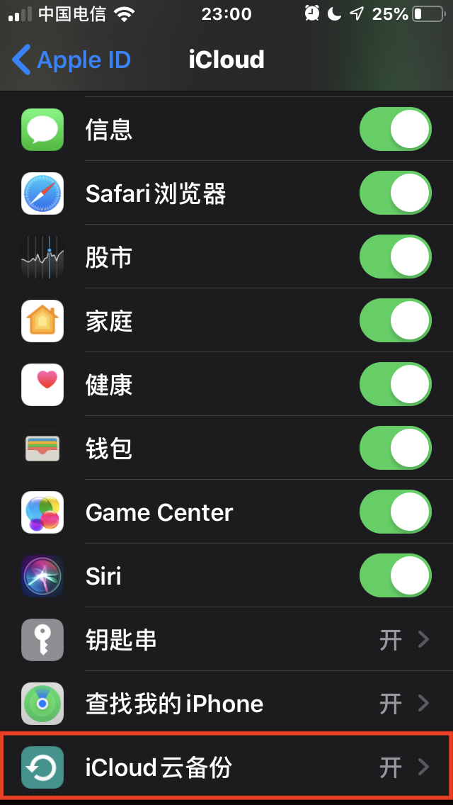 同时 在苹果手机的设置 账号 iCloud 储存空间里边勾选微信。