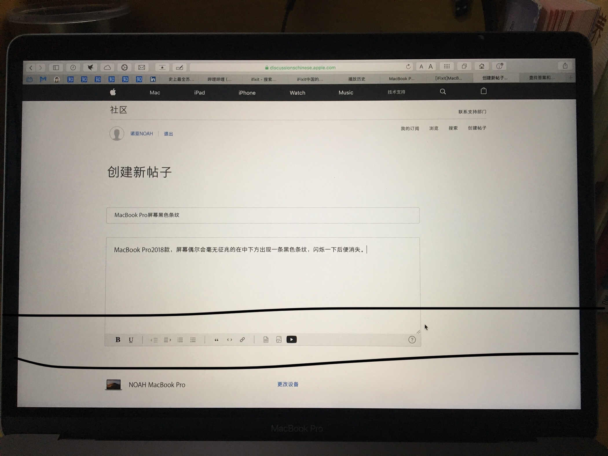 MacBook Pro屏幕局部突然黑色条纹后便消失