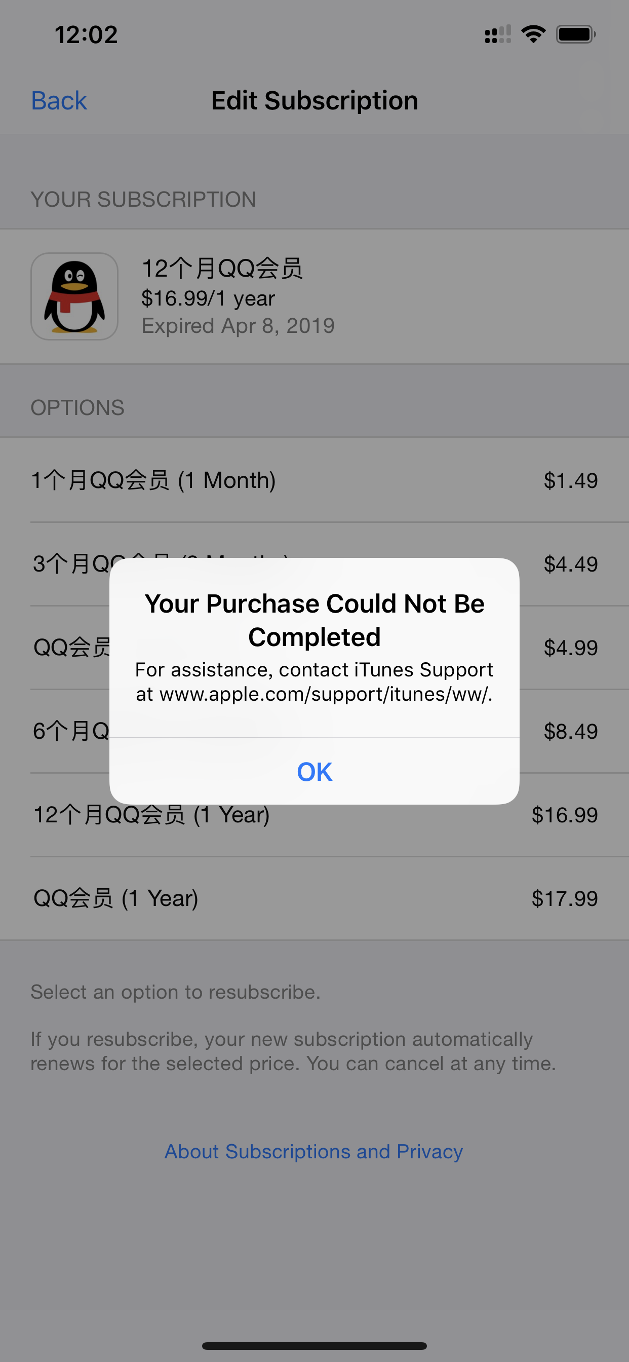 您可以在 iPhone、iPad 或 iPod touch 的“设置”中,或者在 Mac 或 PC 上的 iTunes 中更新账单信息或添加付款方式。如果账单邮寄地址有问题或者付款方式已过期,请轻点或点按付款方式,然后更新付款信息。