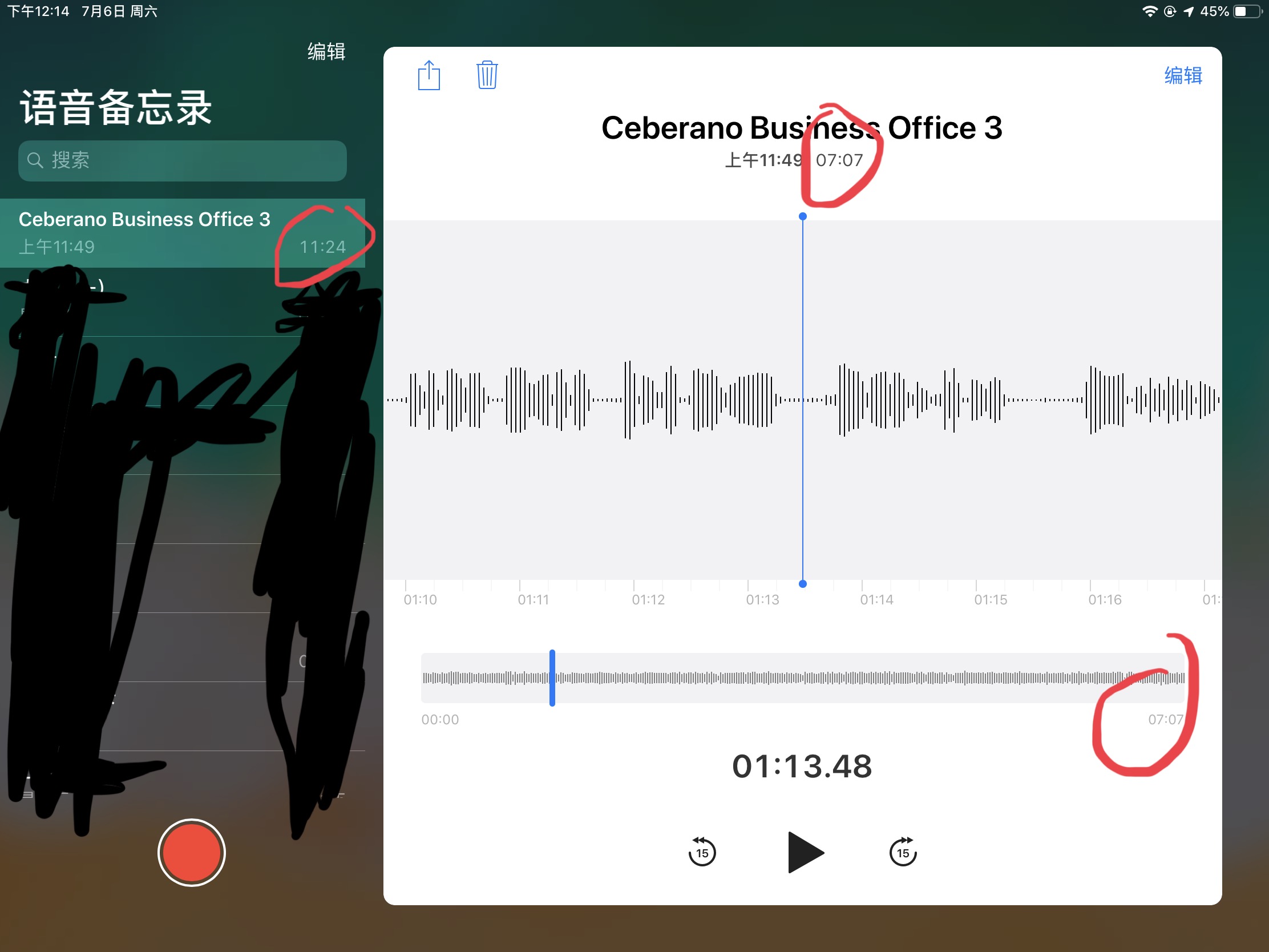 如图,我通过语音备忘录录制了11分24秒的音频,其中用过覆盖功能,但是点击完成之后他只给我保留了7分7秒的音频,7分7秒后面的都不见了。类似情况之前已经出过一次,请问有什么解决的方法?