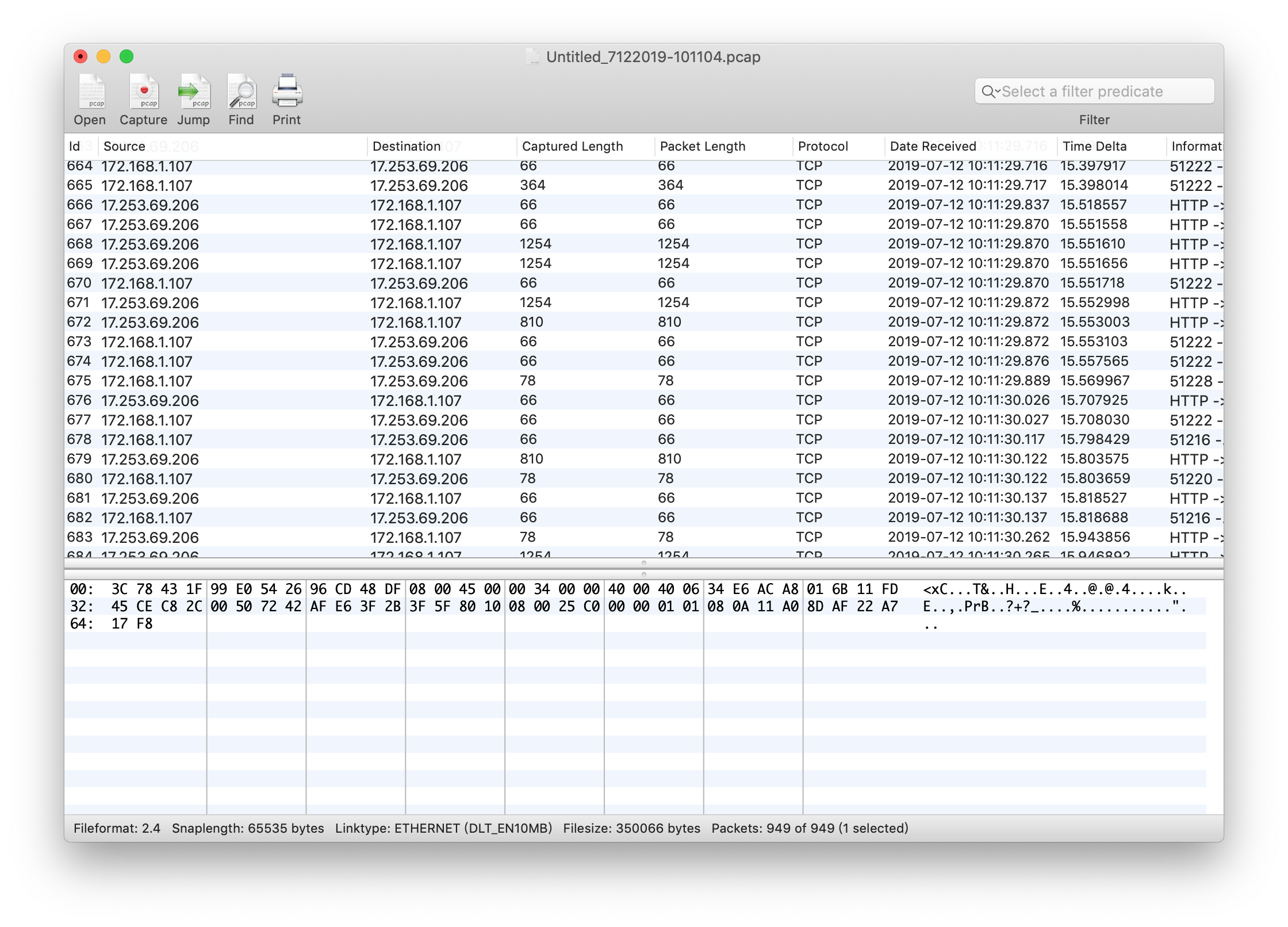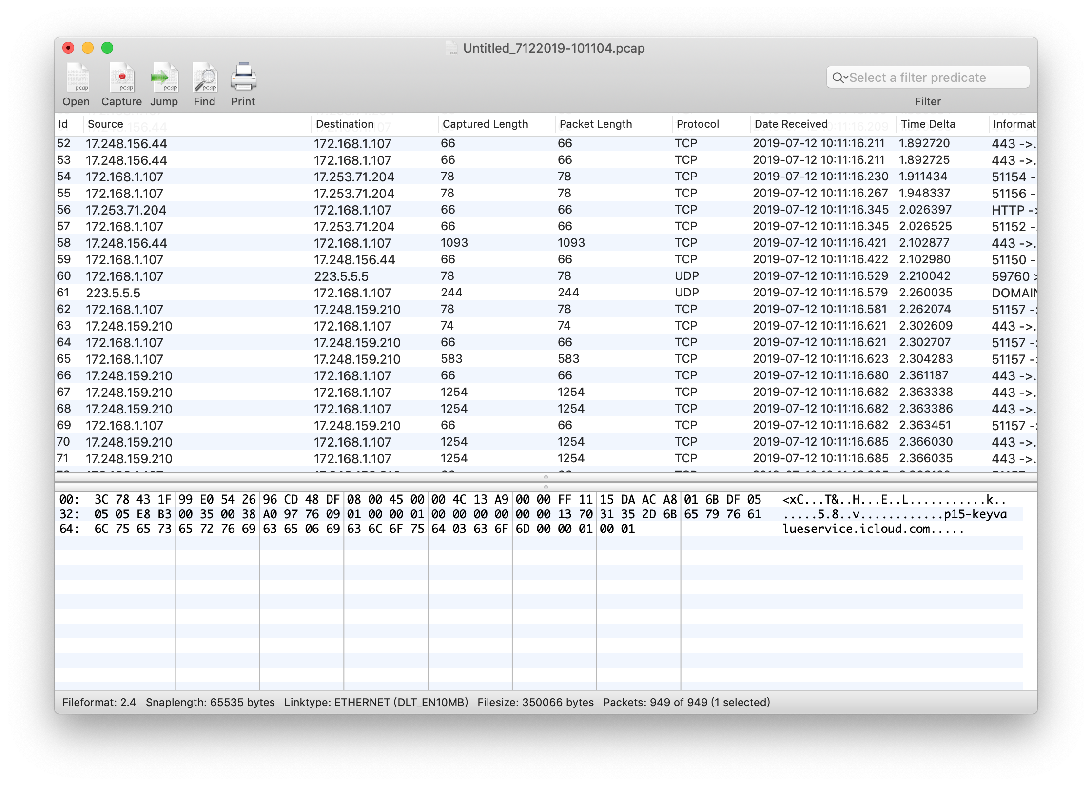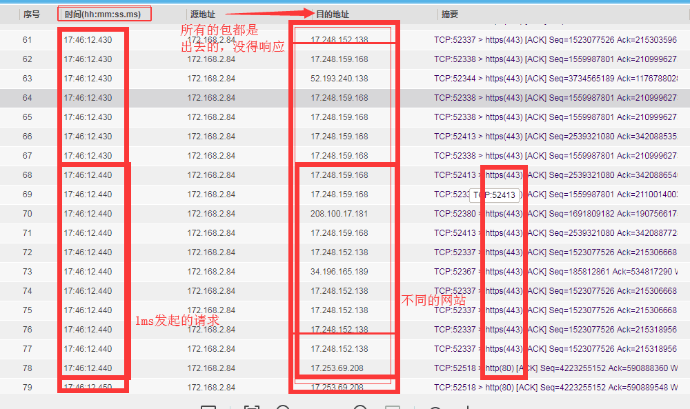 最近上网很慢,通过防火墙发现原因是因为我的safari在上网的时候,短时间(毫秒级)内发送了很多数据包到一些奇怪的IP地址,导致防火墙的策略屏蔽了我的网络访问,下面是我通过抓包工具抓到的一些访问请求截图,请问有谁知道原因吗?