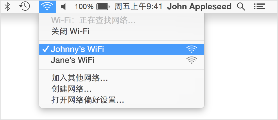 如果您备份到服务器、AirPort 时间返回舱或与 AirPort Extreme 基站相连接的驱动器,请确保 Mac 与您的备份驱动器连接到同一网络。您可以从 Wi-Fi 状态菜单中选择您的无线网络。