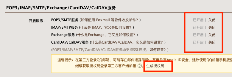 然后 将“ POP3/SMTP服务 ”和“ IMAP/SMTP服务” 从“关闭”转为“开启”
