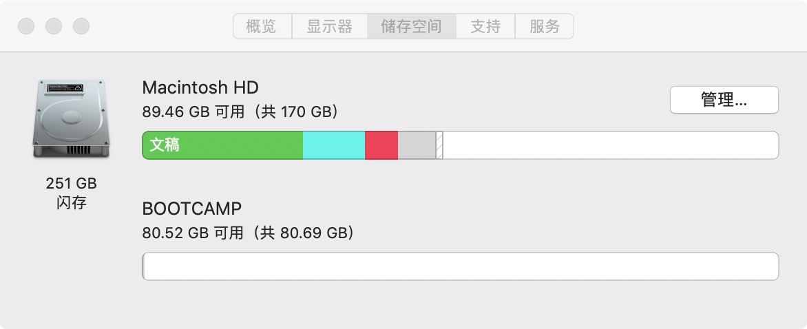 我装的是双系统,通过自动转换助理(Boot Camp)安装,卸载Windows时,没有通过自动转换助理删除Windows,而是直接用磁盘工具抹掉了Windows分区的内容,现在我的电脑上有两个分区但不能合并,Mac系统就少了原来win占据的80G容量。