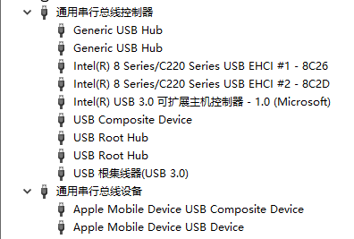 然后一直在尝试,突然就连apple(或者是iPhone)文件夹都没有出现了,而itunes还是正常可以识别的,找了一些解决方案,例如apple官网里的解决方案“如果 iTunes 无法识别 iPhone、iPad 或 iPod设备管理器”中 通用串行总线控制器 里的Apple Mobile Device USB Driver,但是有 通用串行总线设备 Apple Mobile Device USB Device跟Apple Mobile Device USB Composite Device,仍然没有那个文件夹。