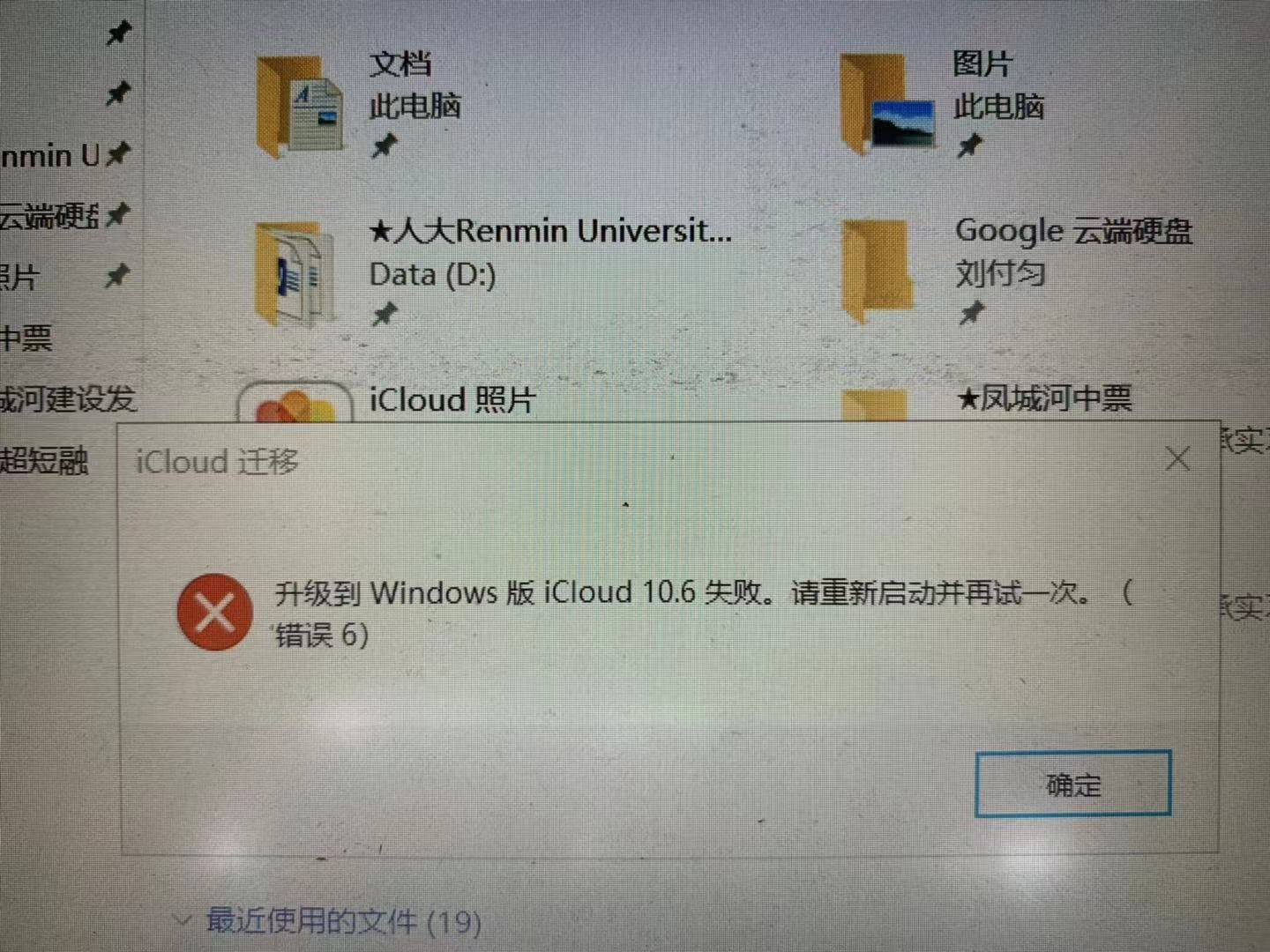 从微软应用商店下载iCloud,启动后似乎在初始化,然后弹出如图所示的错误框,提示错误6。